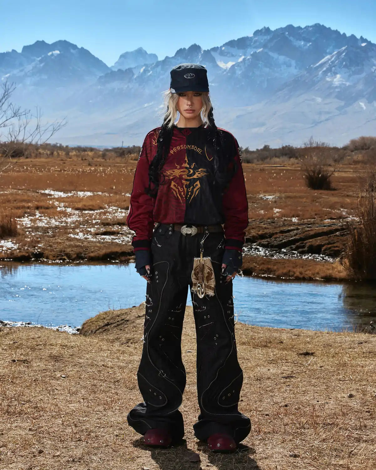 A2: The most striking feature is the bold, contrast red topstitching, creating a strong visual pop against the denim. Additionally, streamlined paneling and decorative metal zippers add a cool, edgy vibe, while cording inside the hem gives the leg opening a structured, three-dimensional shape.