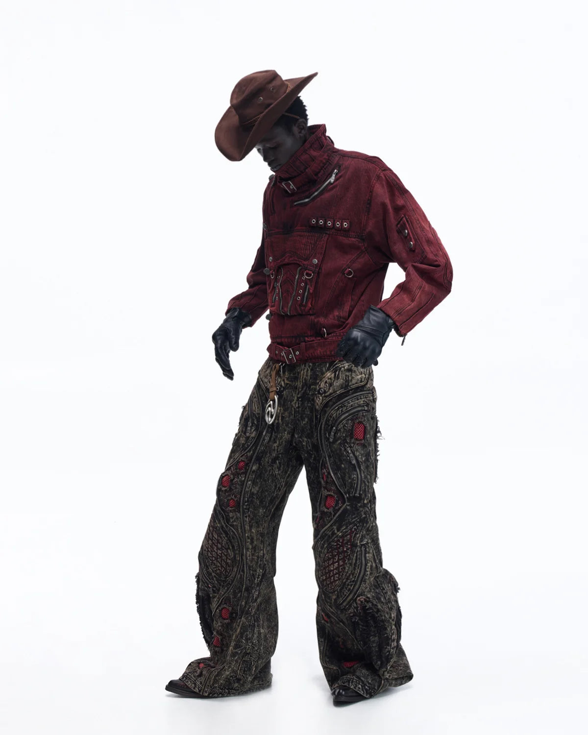 A2: Oval embroidered elbow patches use padded seed-stitch embroidery to create raised, graduated circular patterns. The washed and over-dyed finish adds natural color depth, while custom antique silver snap buttons and zipper enhance both function and detail.