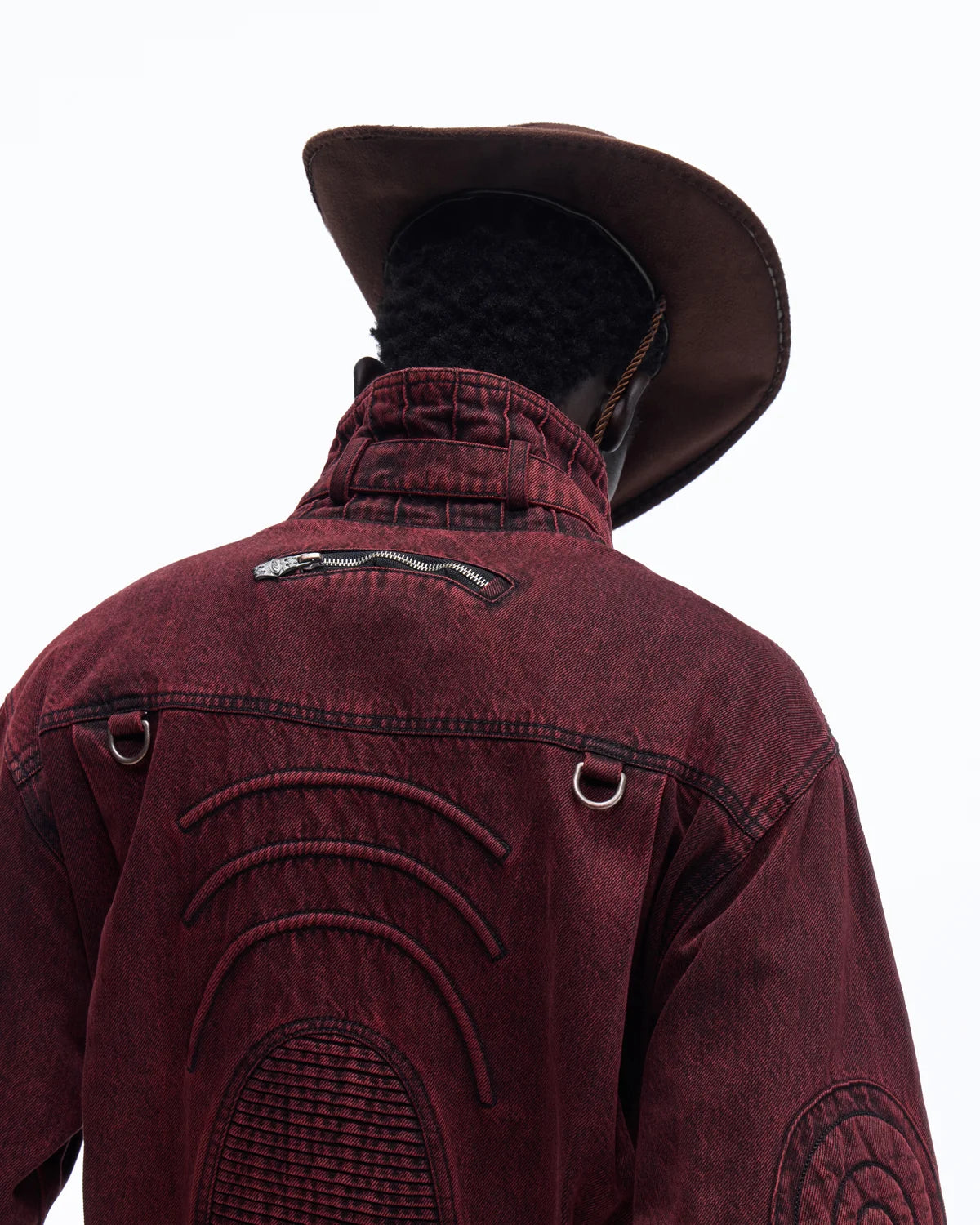 A1: This stand-collar denim jacket is crafted from 100% cotton black washable denim with a thick, durable texture. The washed and over-dyed finish softens the fabric while revealing subtle dark red undertones, enhancing comfort and depth.