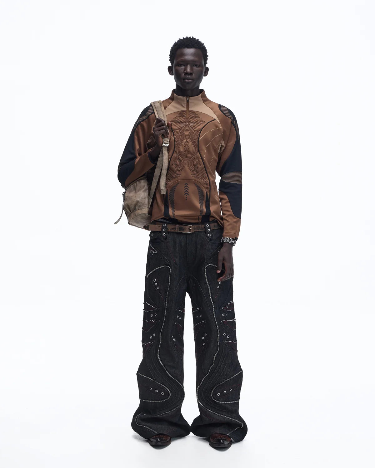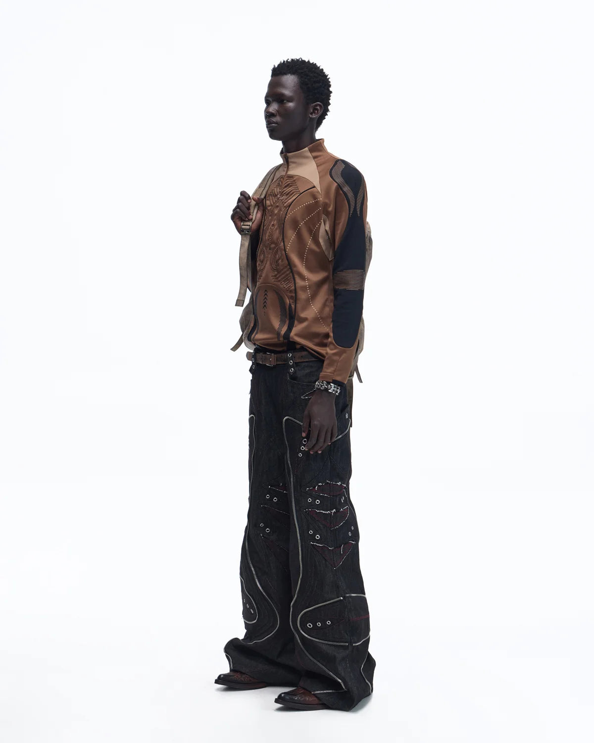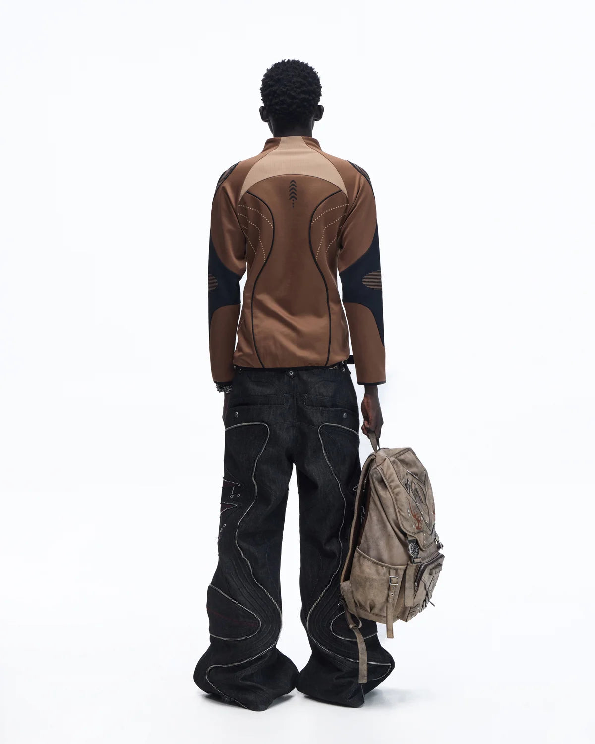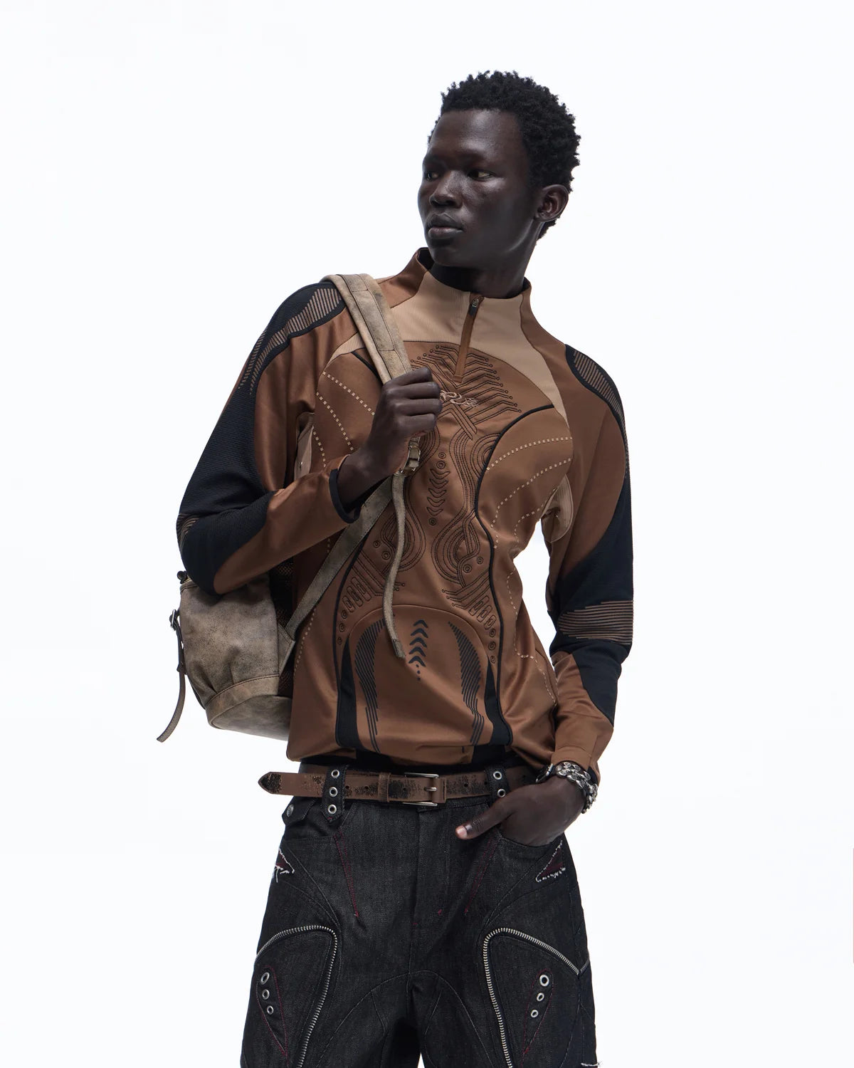 A1: It's engineered with multiple high-performance sport fabrics. The mock neck and sleeves feature beige and black textured materials, while strategic seaming is outlined with black piping - creating a look that balances athletic function with structured design.