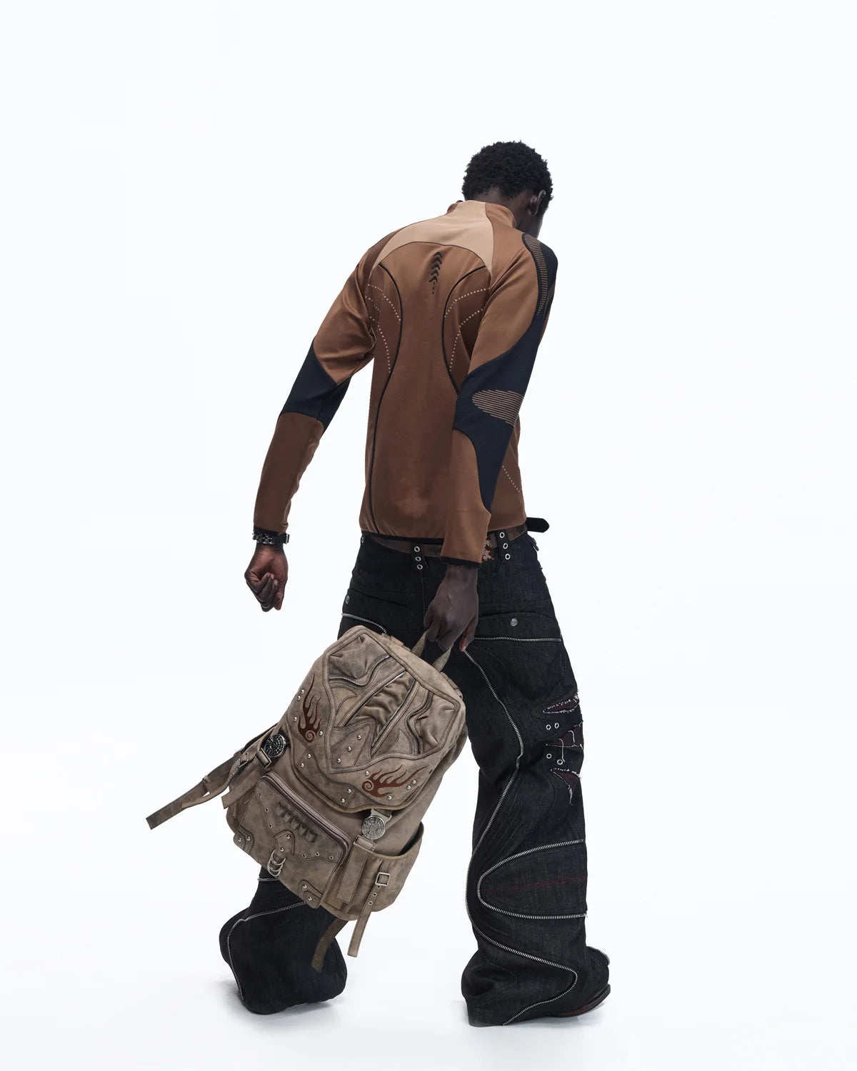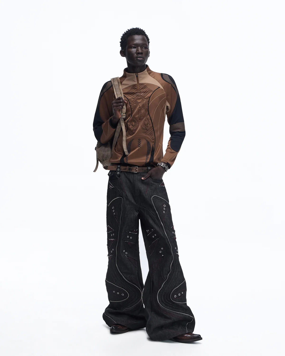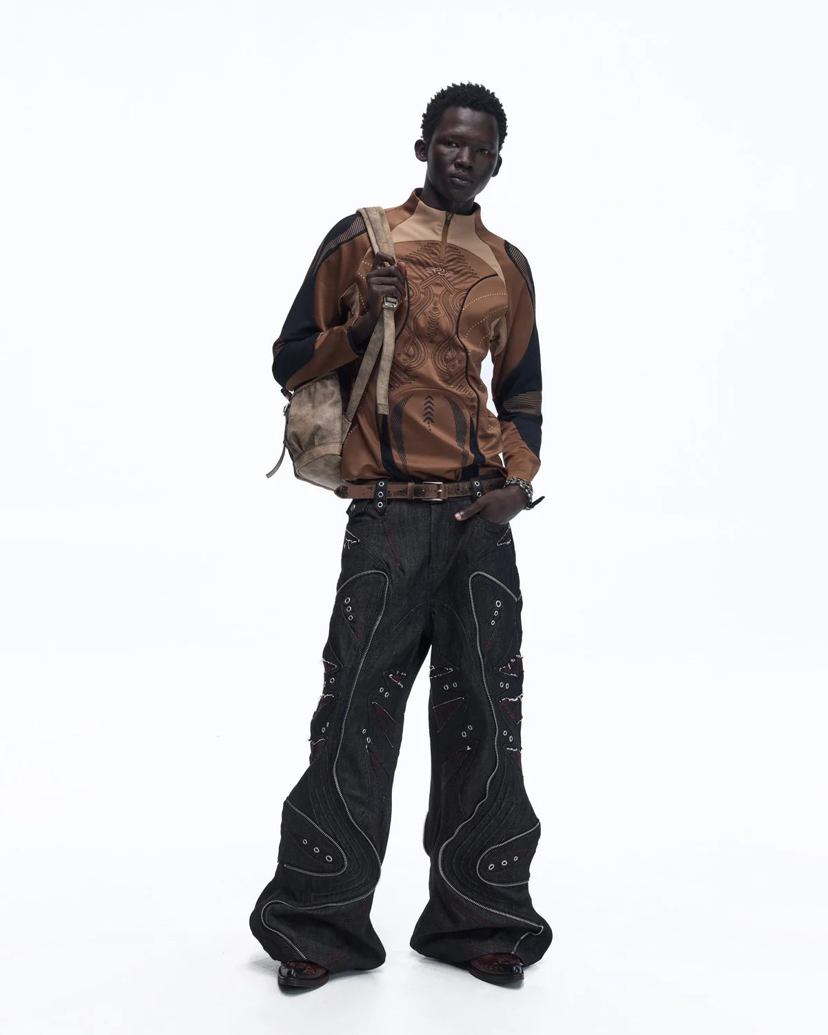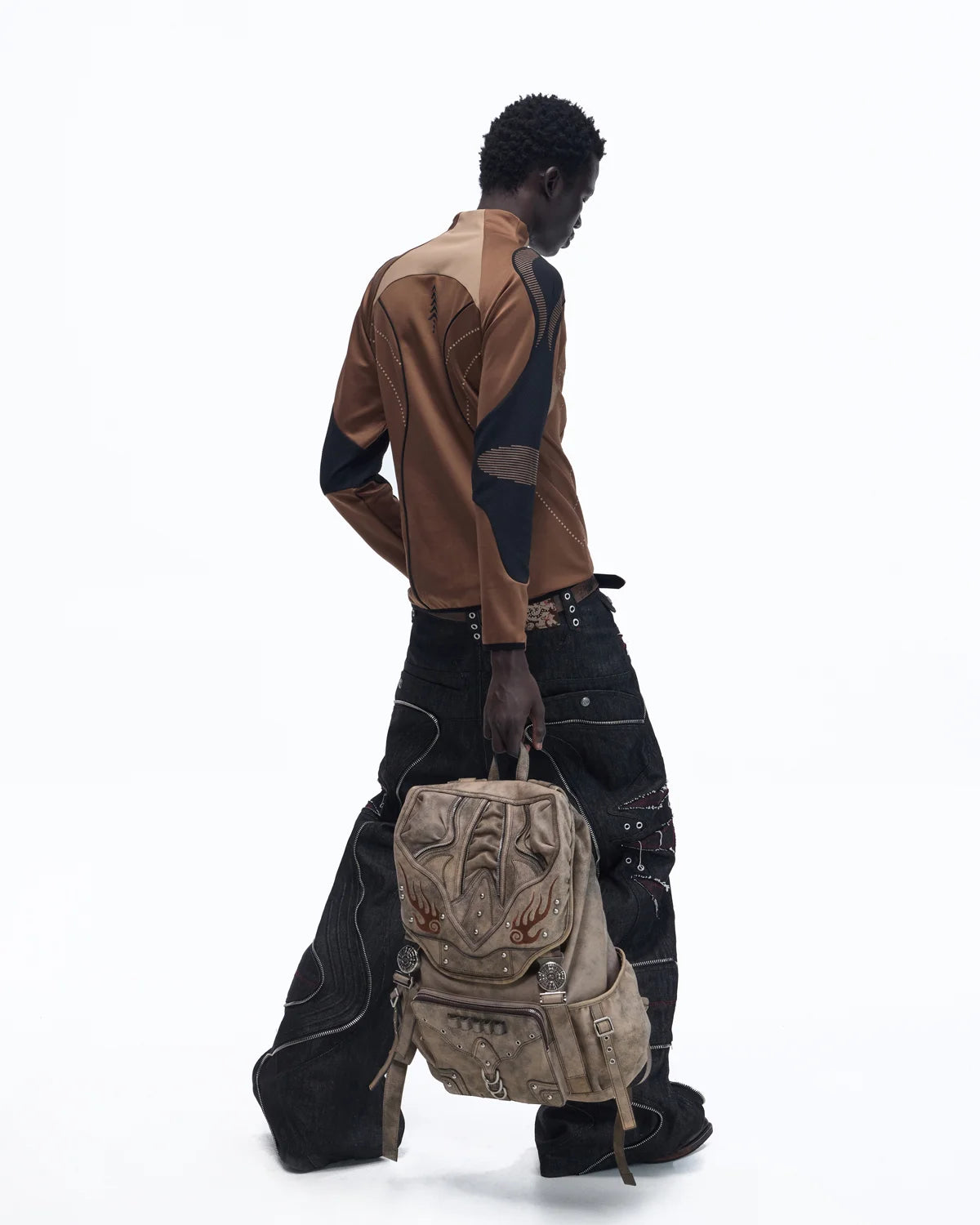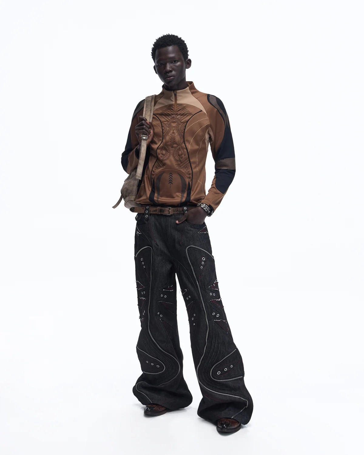 A1: It's engineered with multiple high-performance sport fabrics. The mock neck and sleeves feature beige and black textured materials, while strategic seaming is outlined with black piping - creating a look that balances athletic function with structured design.