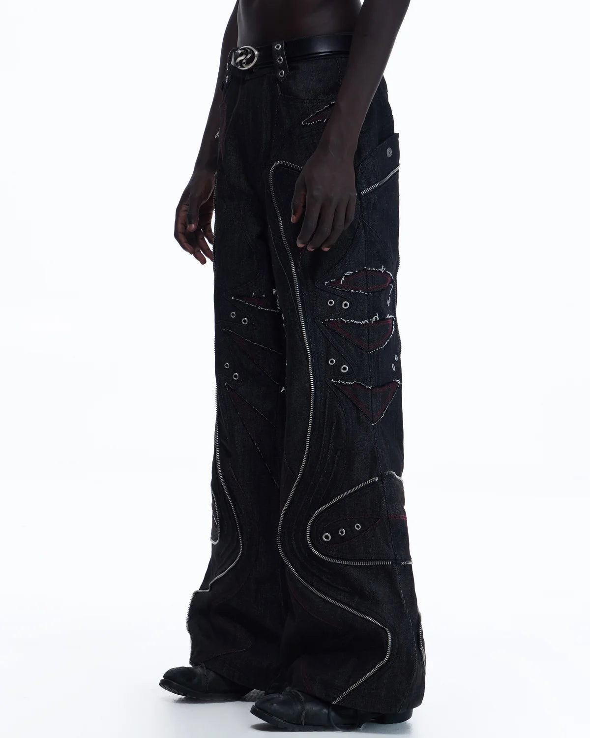 A2: The most striking feature is the bold, contrast red topstitching, creating a strong visual pop against the denim. Additionally, streamlined paneling and decorative metal zippers add a cool, edgy vibe, while cording inside the hem gives the leg opening a structured, three-dimensional shape.