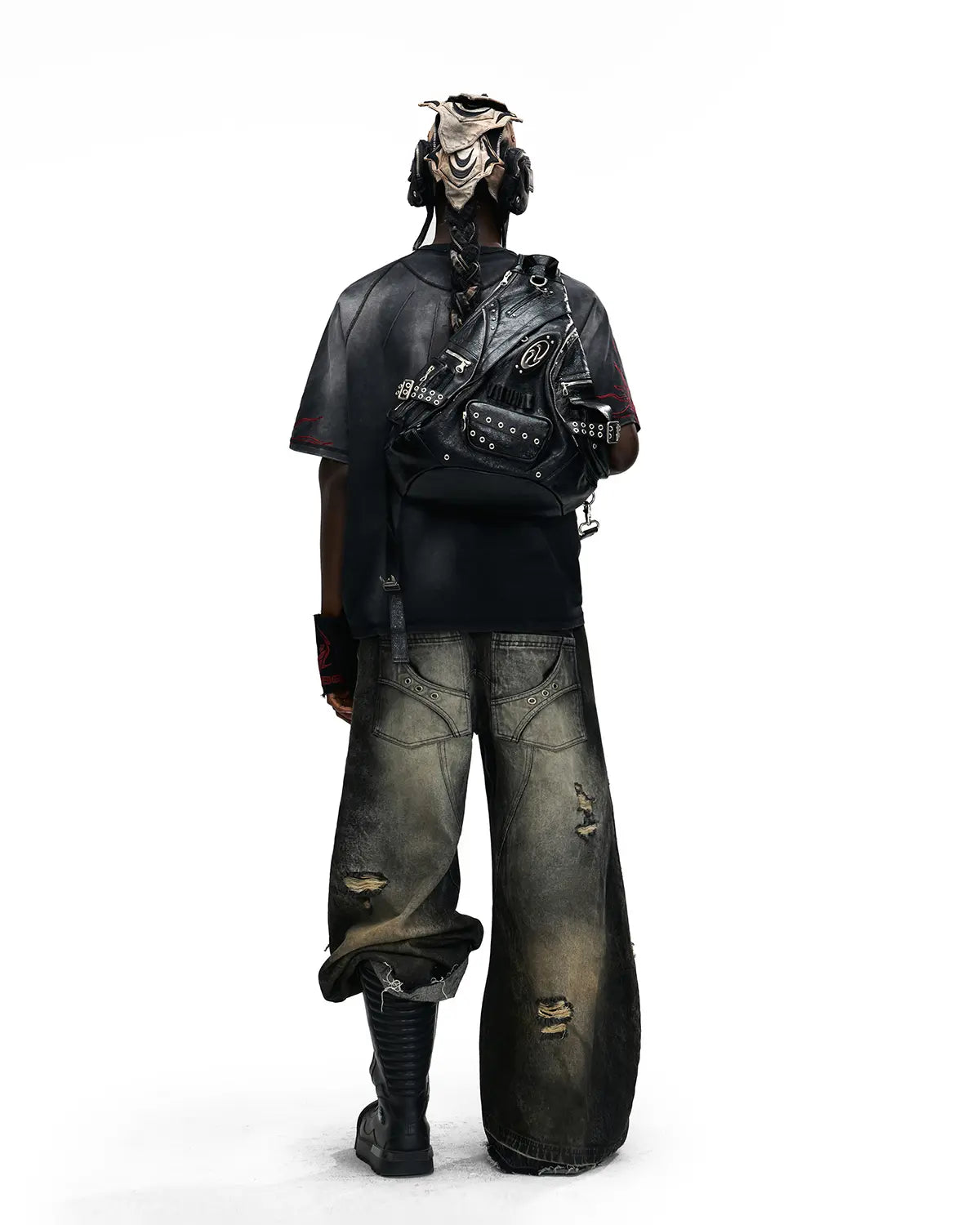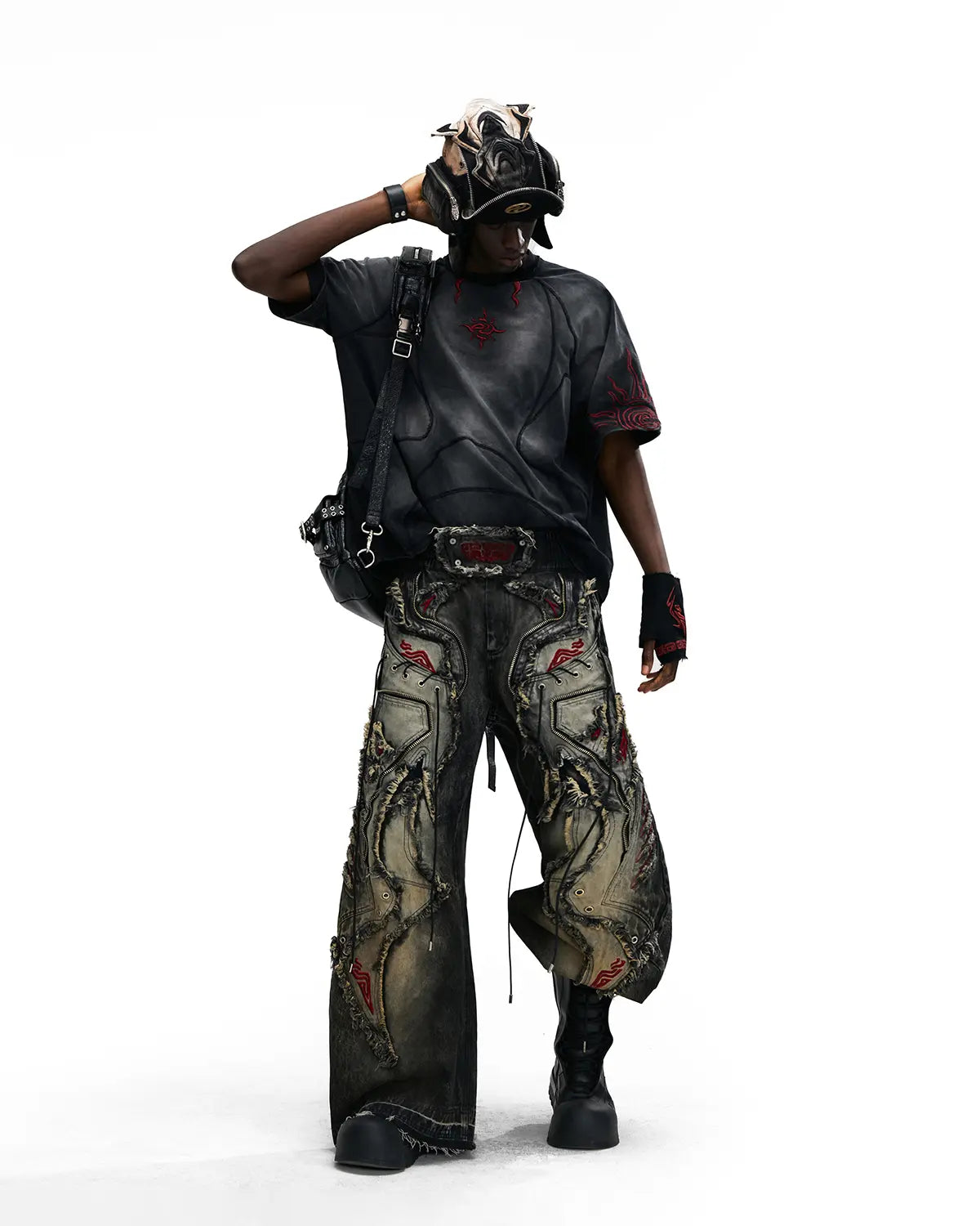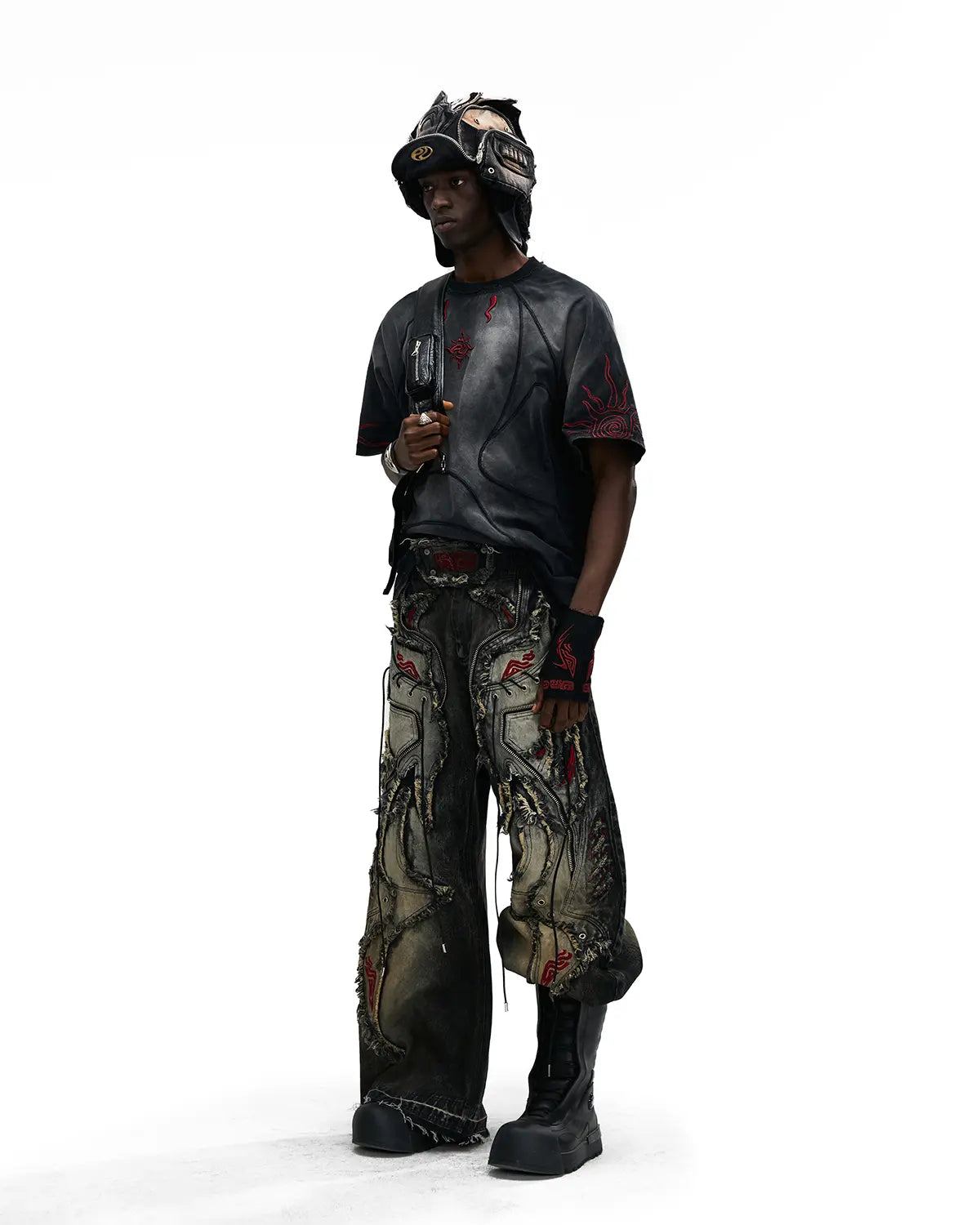 Personsoul Red-Embroidered Totem Wide-Leg Denim Jeans