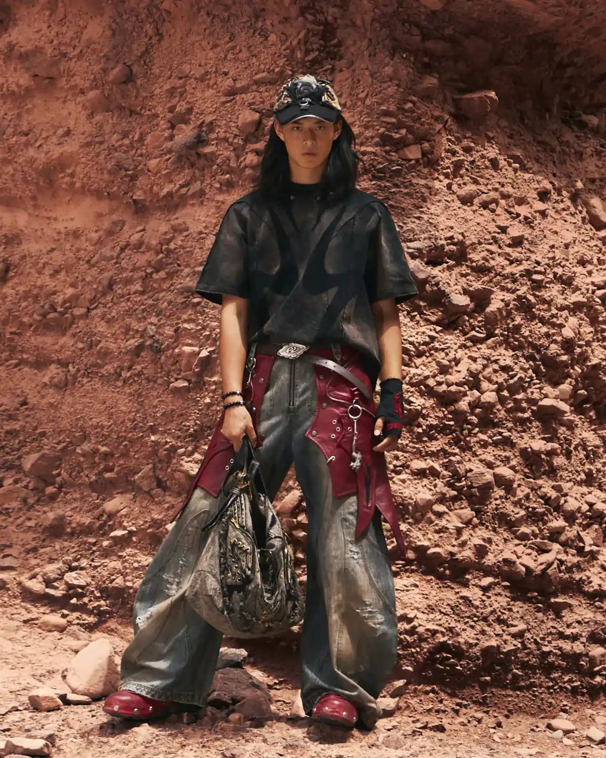 Personsoul Red Leather Waist-Strap Curved Denim Jeans