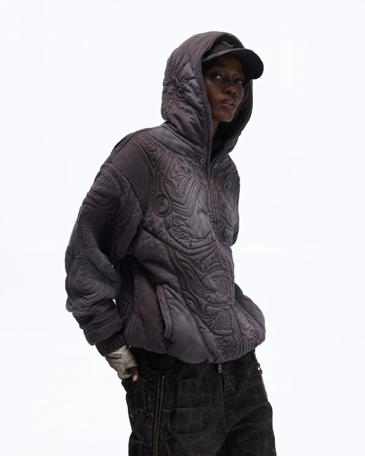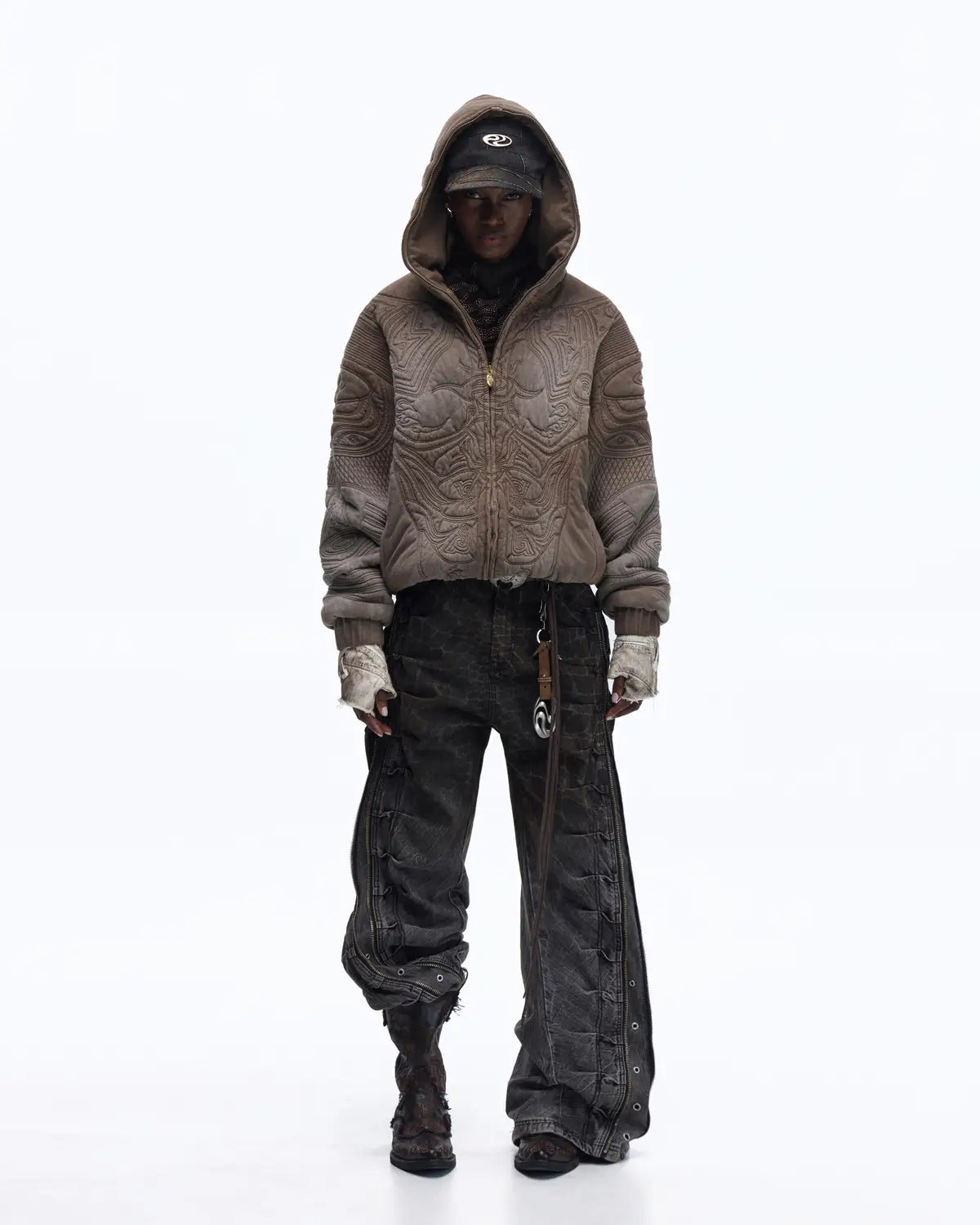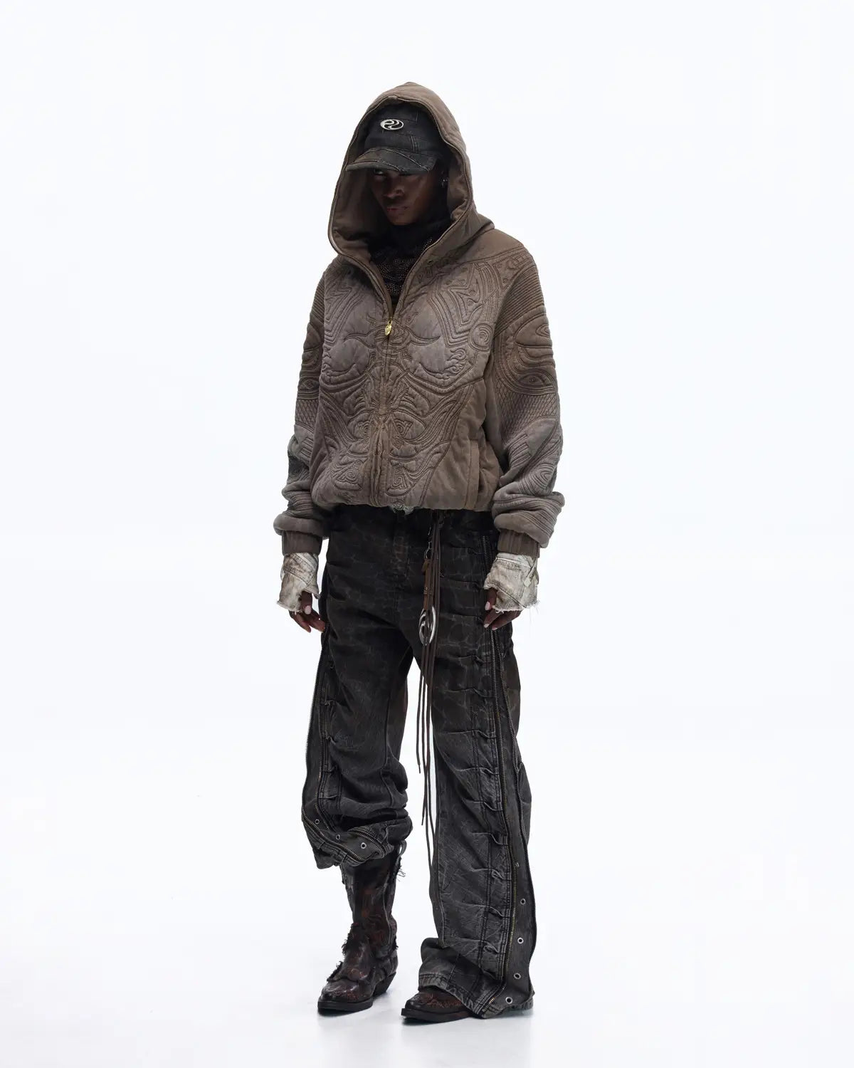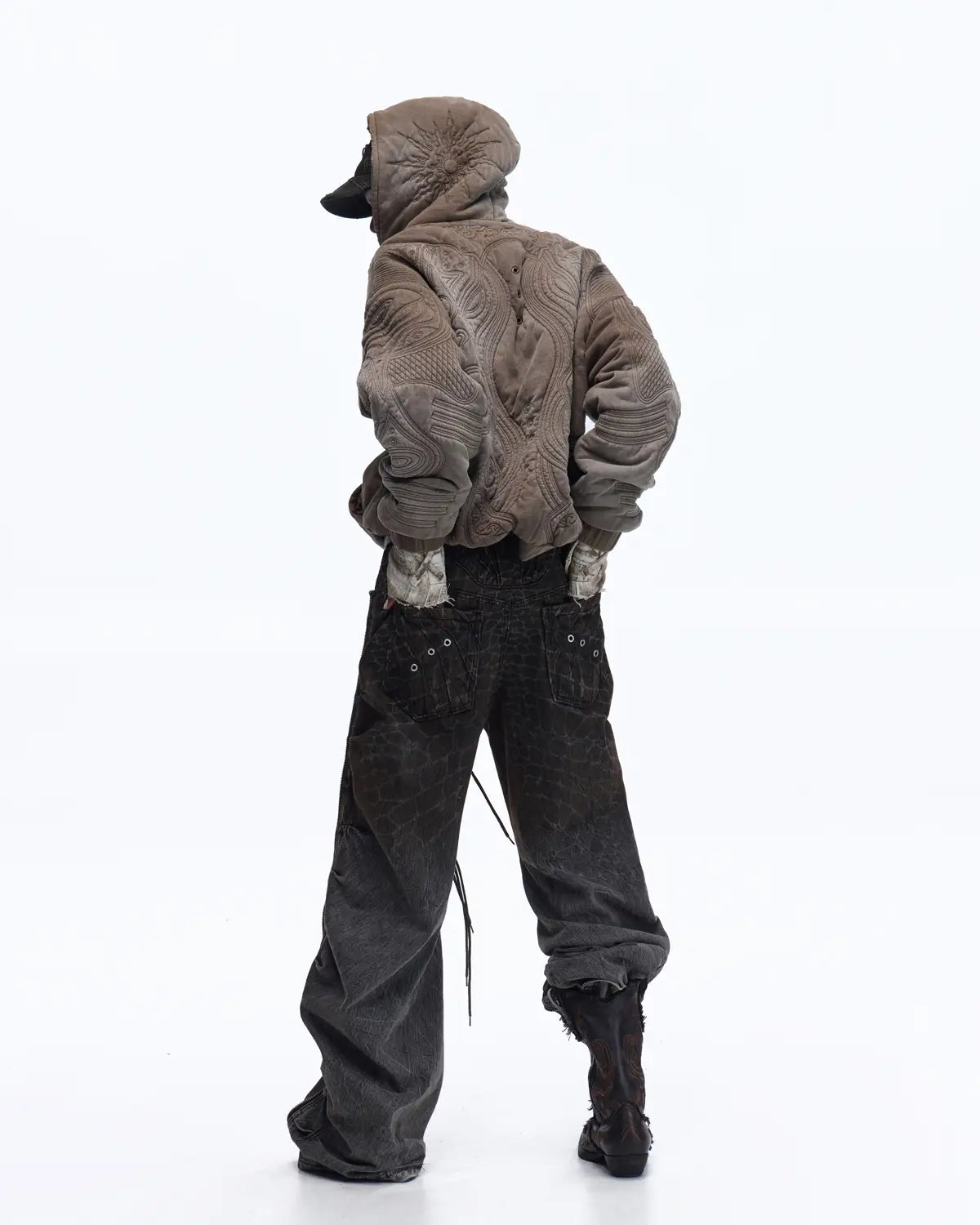 A: Through intricate, all-over embroidery that fuses our brand logo with traditional Chinese motifs. The hoodie is then treated with a special garment-dyeing process to achieve its natural, worn-in vintage look.